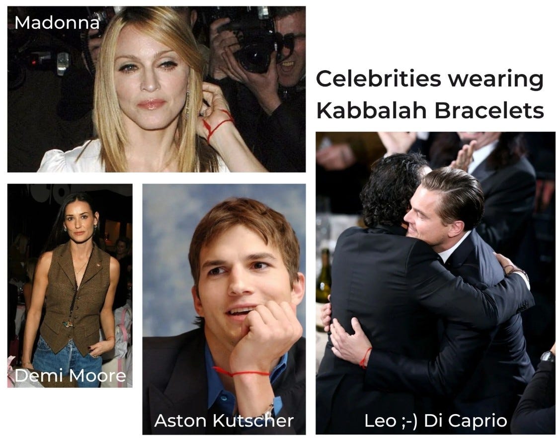 All secret societies including the Masons are based on the Kabbalah. So is the evil Jewish Talmud. Many pagan religions such as Buddhism wear these Kabbalistic bracelets. This is an open sign that someone is into witchcraft and sorcery. They control nearly everything that you see and hear which is proof that their witchcraft is working. They do love to rub it in your face.